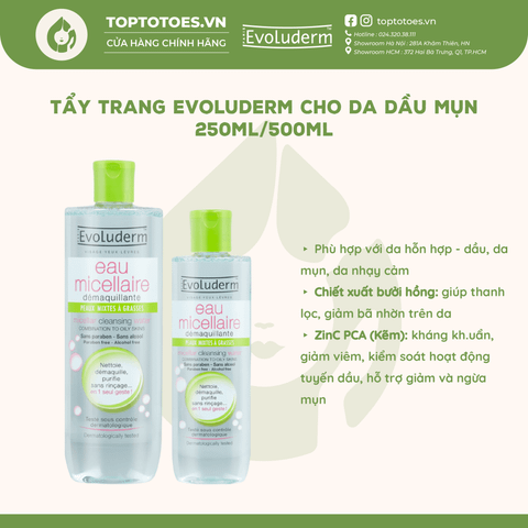 Nước tẩy trang Evoluderm Micellar Cleansing Water - Xanh 500ml (da dầu mụn)